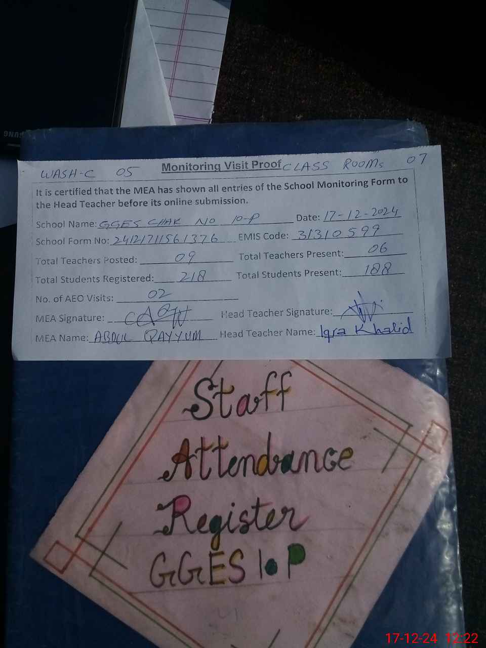 | Attendance Register | Head Teacher | MEA with School | Visit Proof |