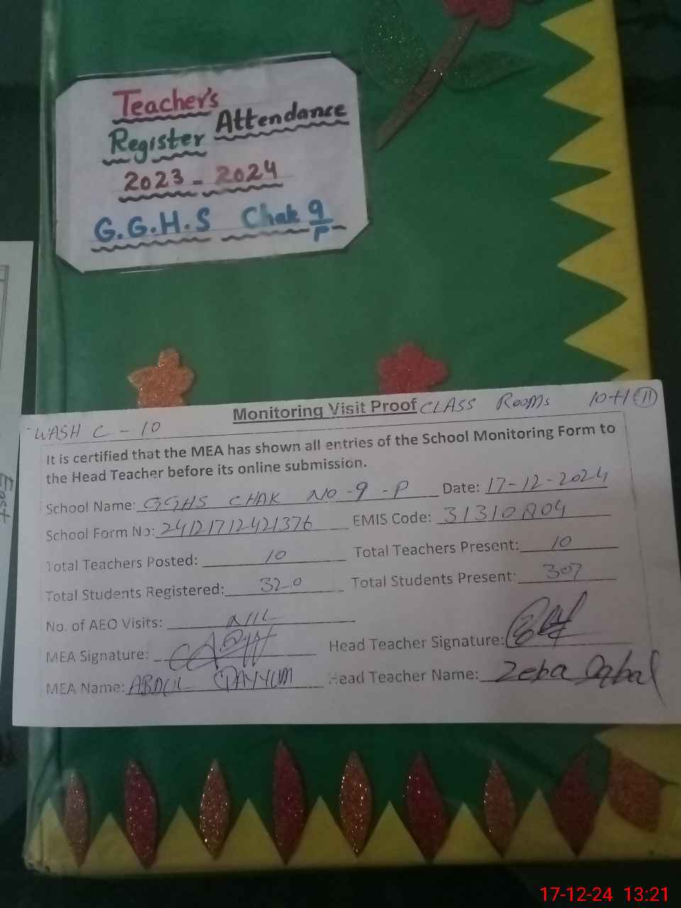| EMIS Code: 31310804 | Name of School: GGHS CHAK NO. 9/P | |||