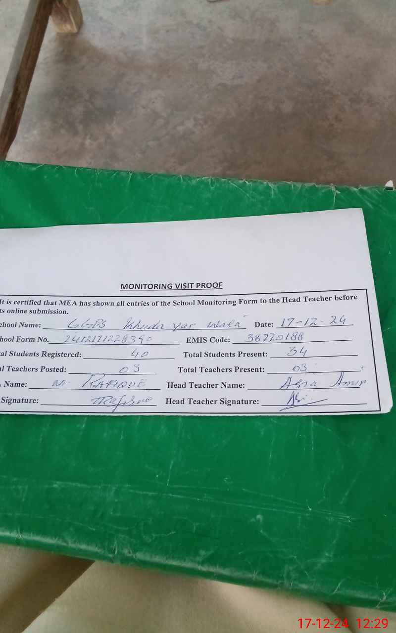 | EMIS Code: 38220188 | Name of School: GGPS KHUDA YAR WALA | |||