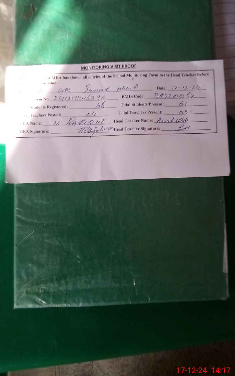 | EMIS Code: 38220052 | Name of School: GPS JAMAL KHAIL | |||
