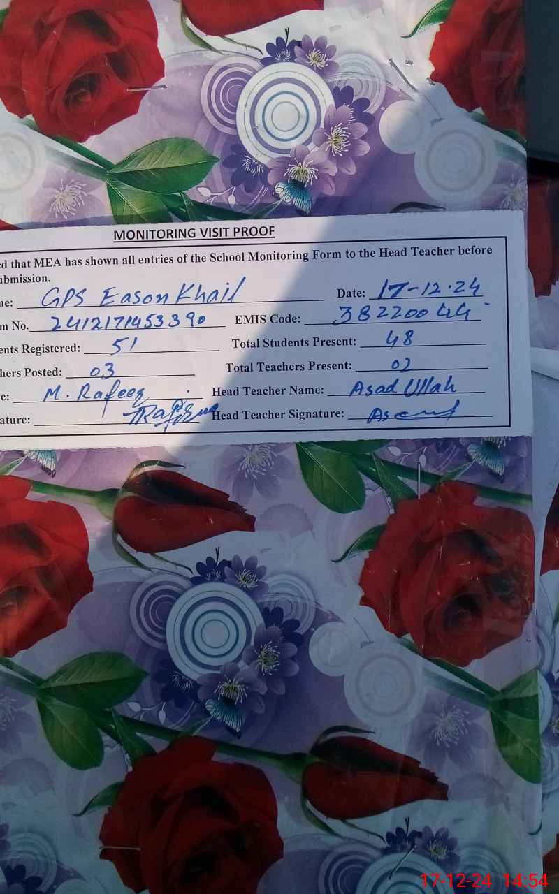 | EMIS Code: 38220044 | Name of School: GPS EASAN KHAIL | |||