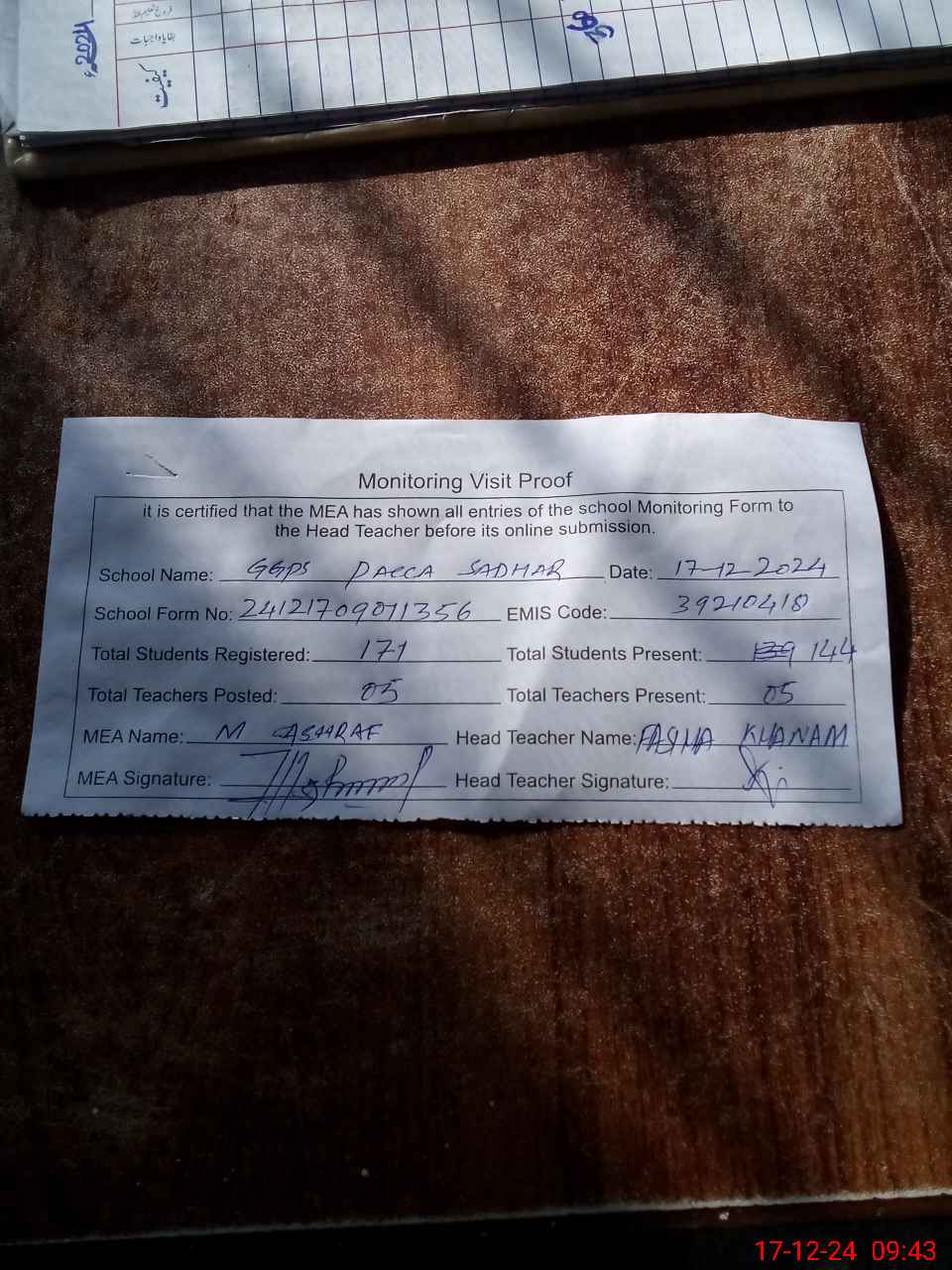 | Attendance Register | Head Teacher | MEA with School | Visit Proof |