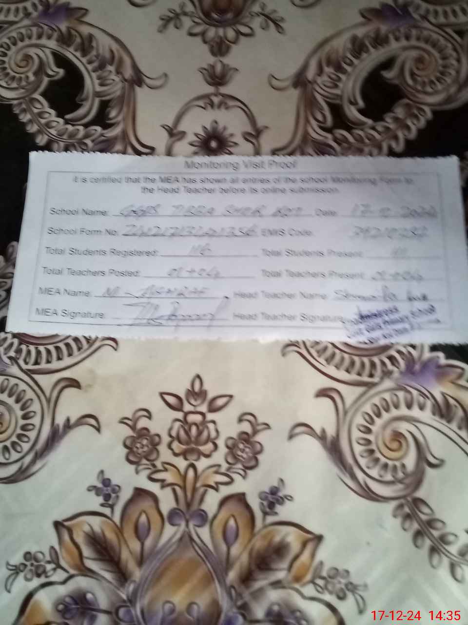 | Attendance Register | Head Teacher | MEA with School | Visit Proof |