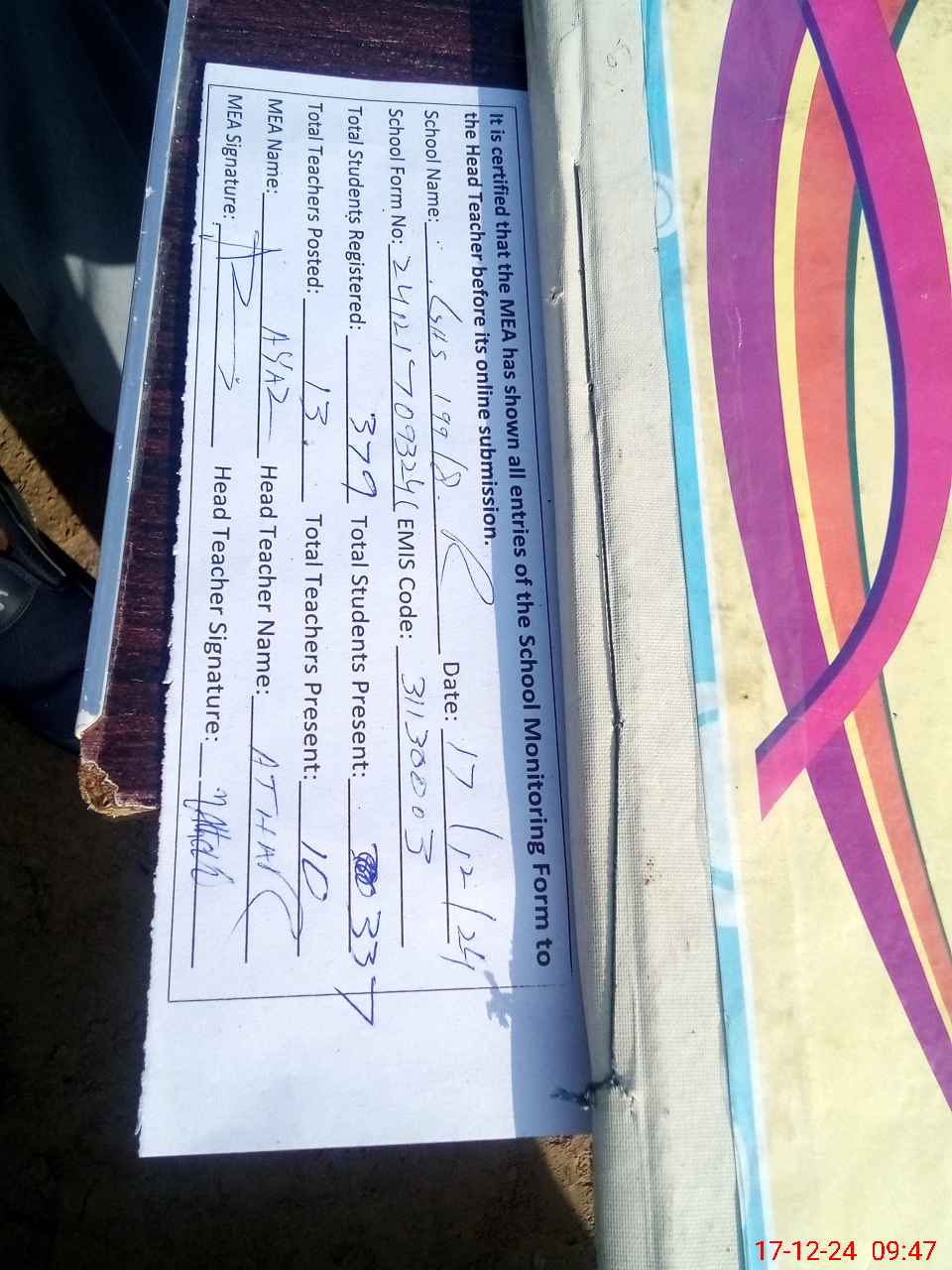 | Name: MU**** AT**** Designation: (School Headmaster's/Headmistress's) SST Phone/Cell Number: 03**** |