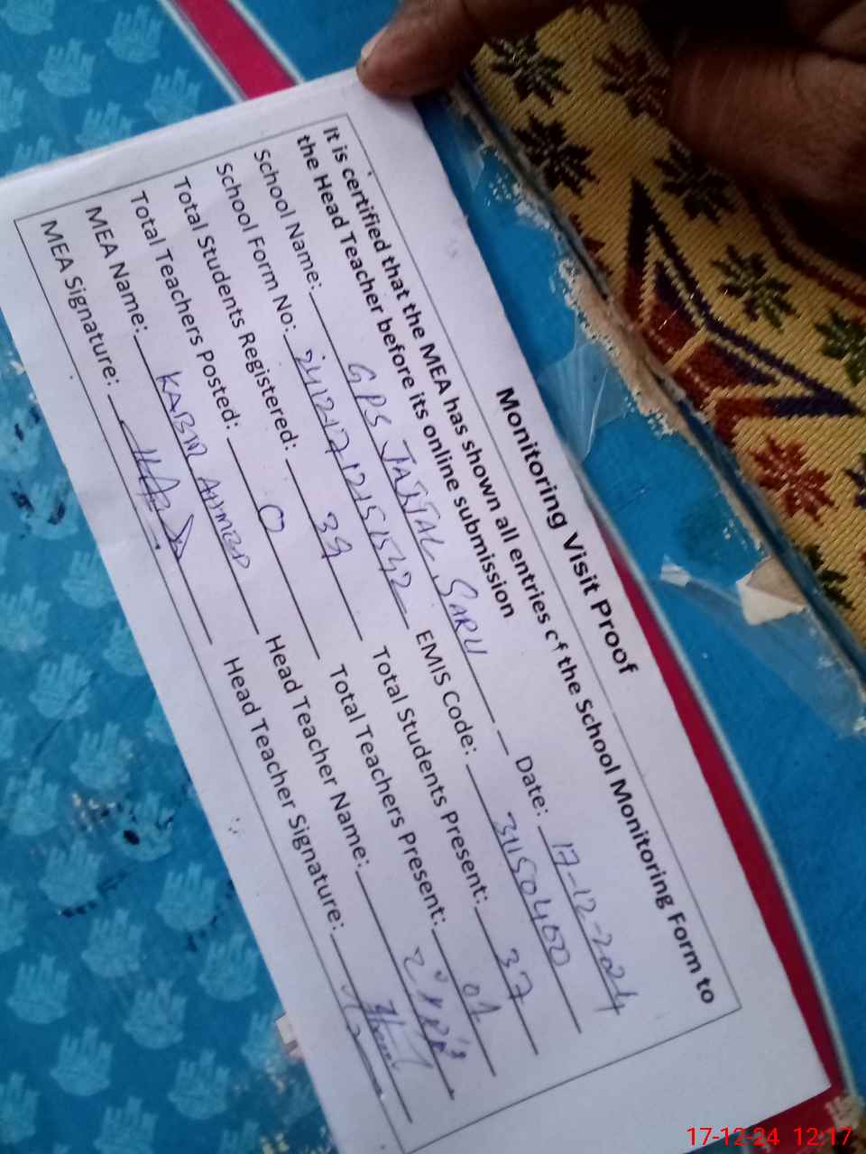 | Attendance Register | Head Teacher | MEA with School | Visit Proof |