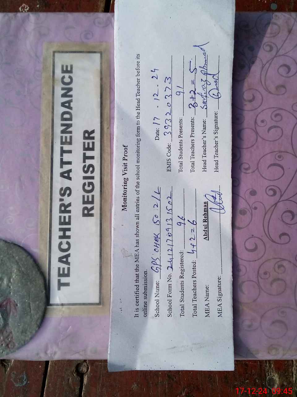 | Attendance Register | Head Teacher | MEA with School | Visit Proof |