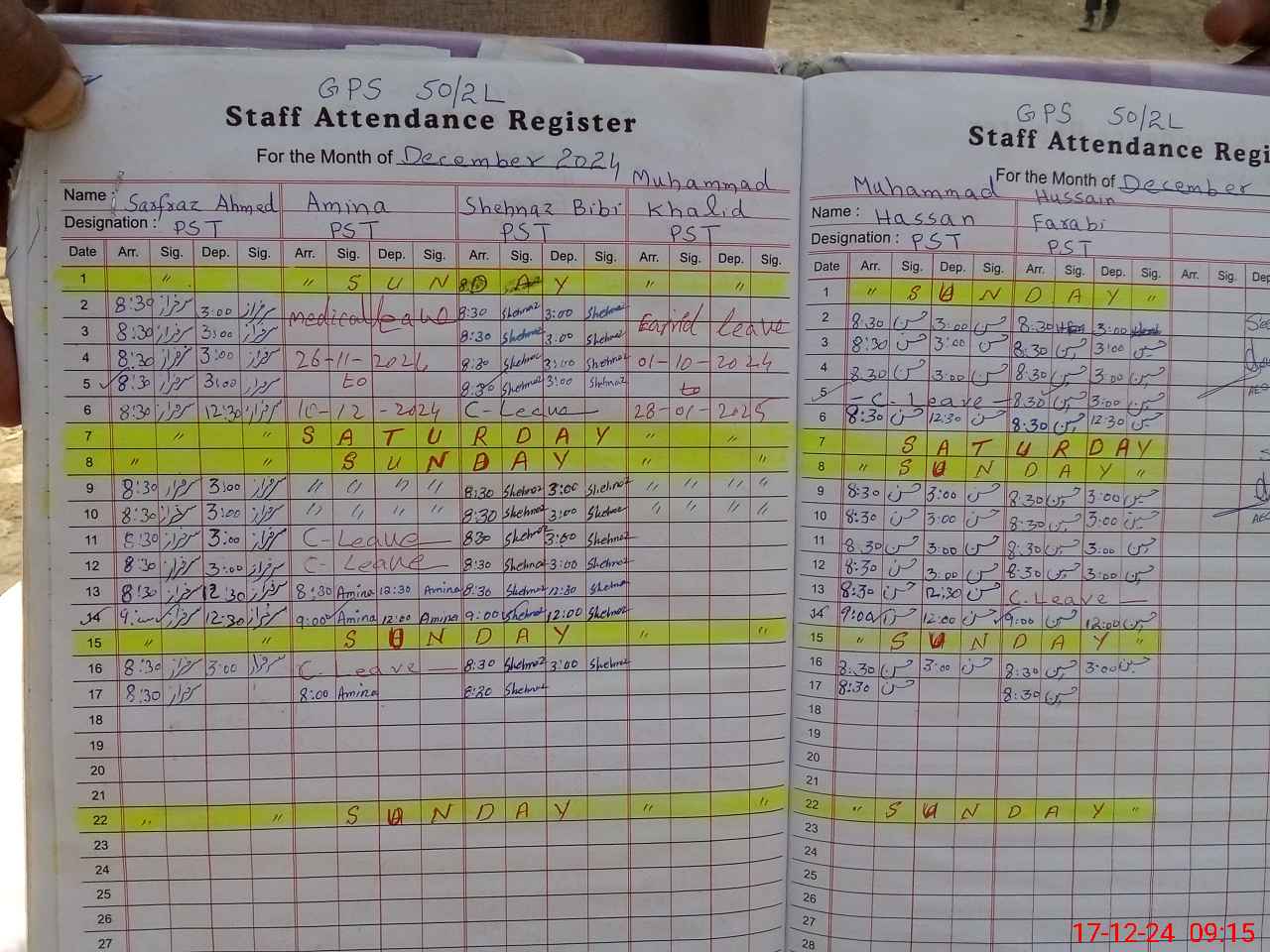 | CNIC | Full Name | Designation | R/C | Absence During Last Calender Month |