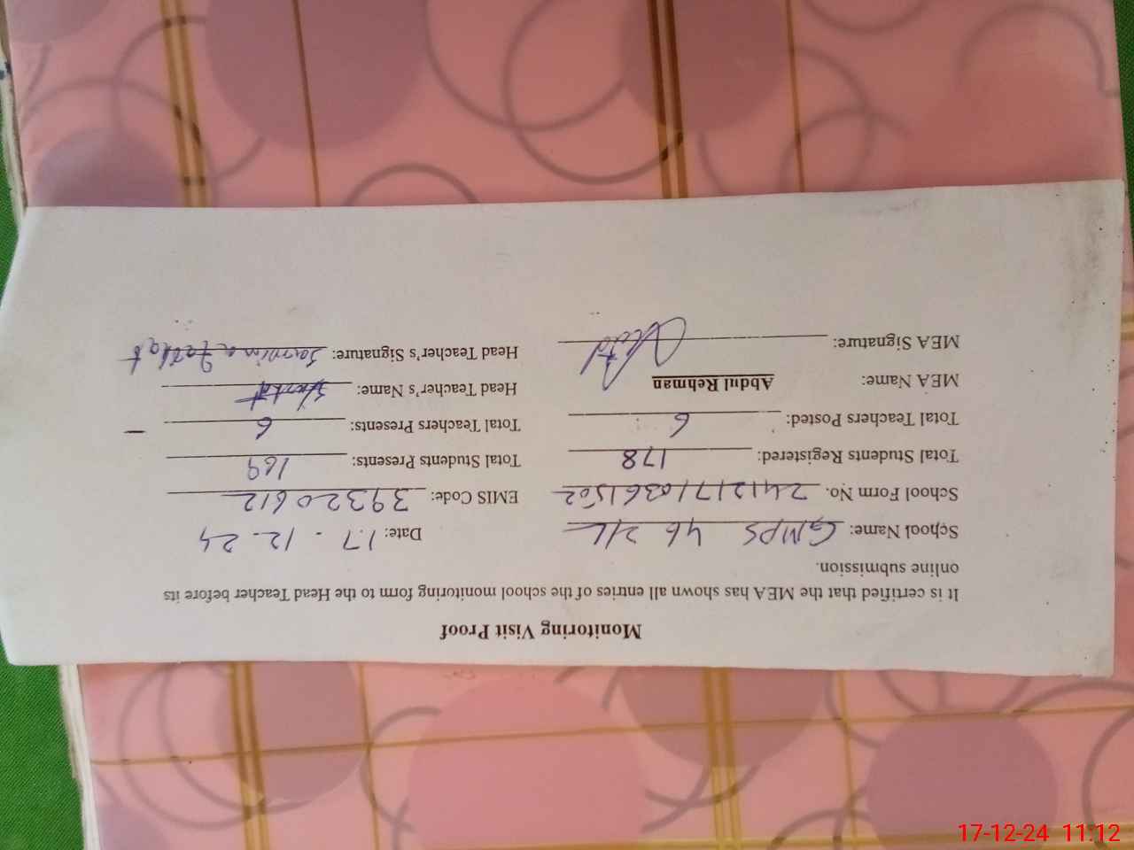 | Attendance Register | Head Teacher | MEA with School | Visit Proof |