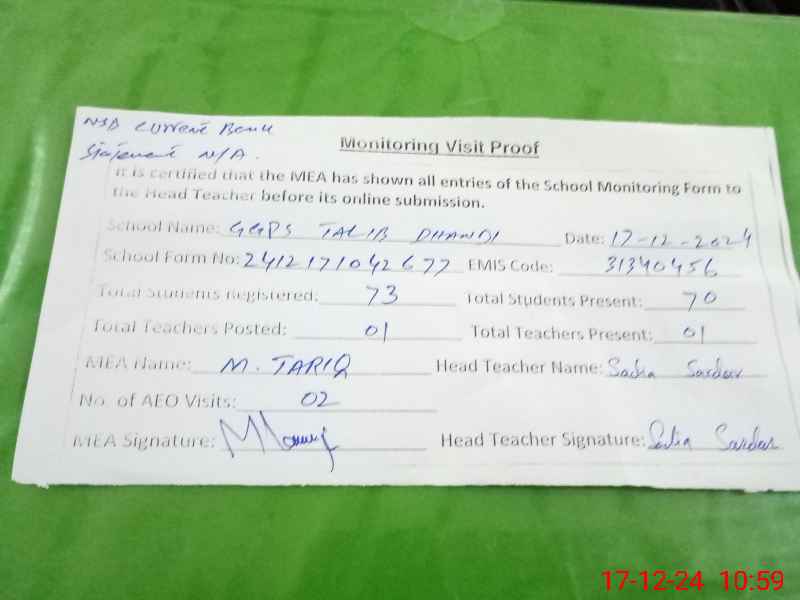 | EMIS Code: 31340456 | Name of School: GGPS TALIB DHANDI | |||