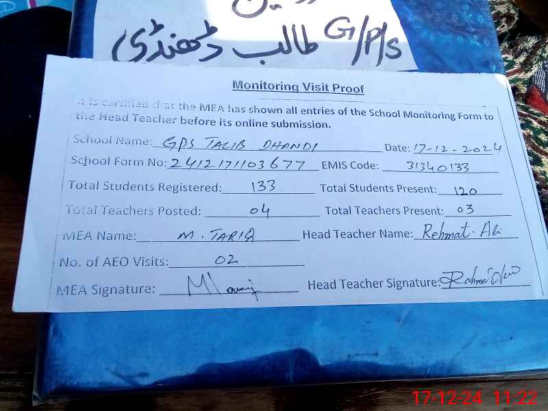 | EMIS Code: 31340133 | Name of School: GPS TALIB DHANDI | |||