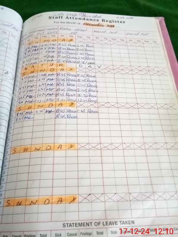 | CNIC | Full Name | Designation | R/C | Absence During Last Calender Month |