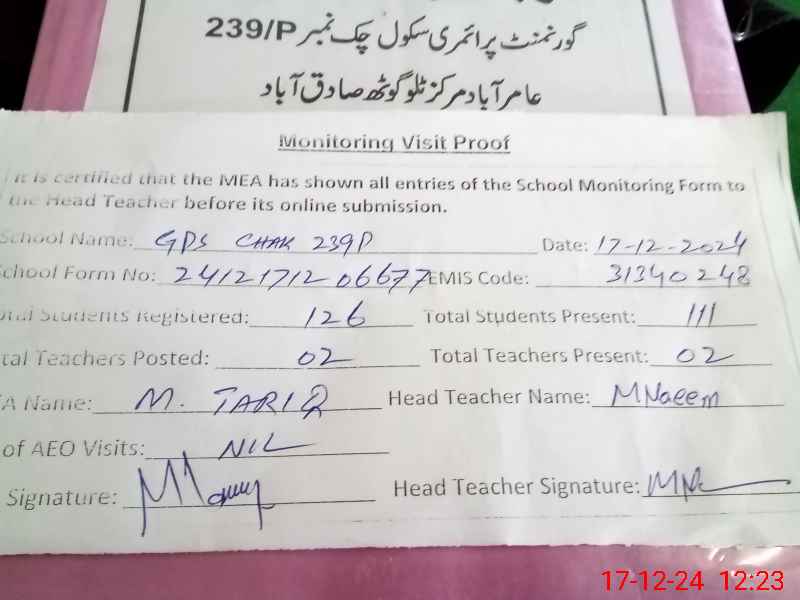 | EMIS Code: 31340248 | Name of School: GPS CHAK NO 239 P | |||