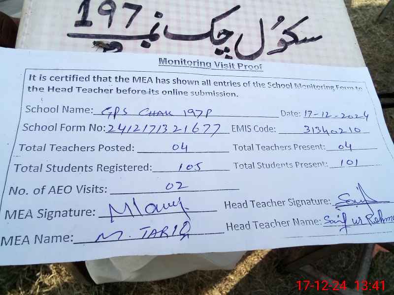 | EMIS Code: 31340210 | Name of School: GPS CHAK NO 197/P | |||