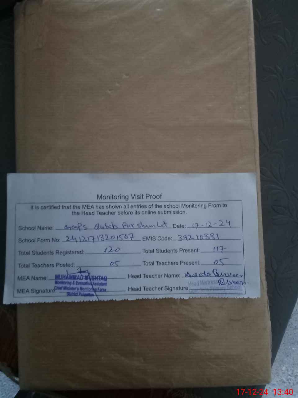 | EMIS Code: 39210381 | Name of School: GGPS QUTAB PUR SHAM LAT | |||