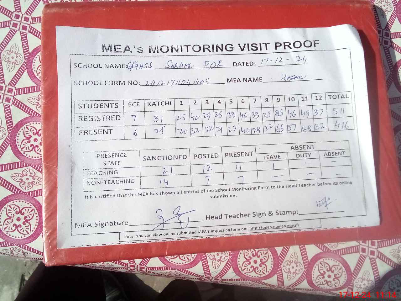 | Attendance Register | Head Teacher | MEA with School | Visit Proof |