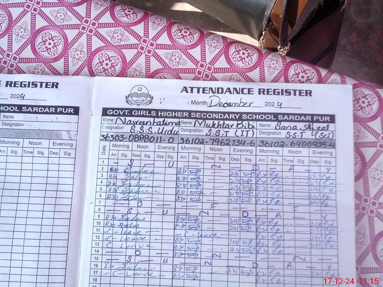| CNIC | Full Name | Designation | R/C | Absence During Last Calender Month |