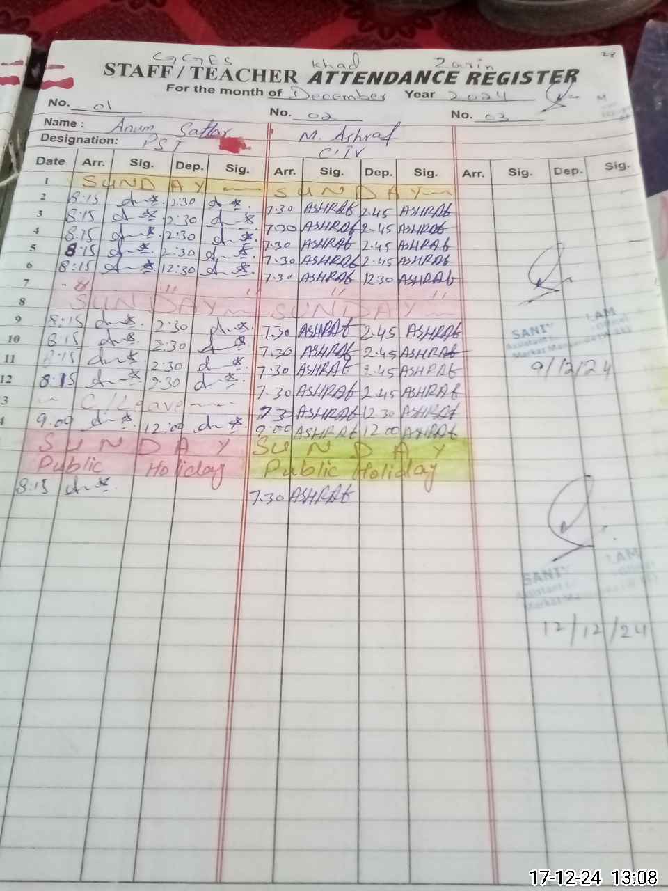| CNIC | Full Name | Designation | R/C | Absence During Last Calender Month |