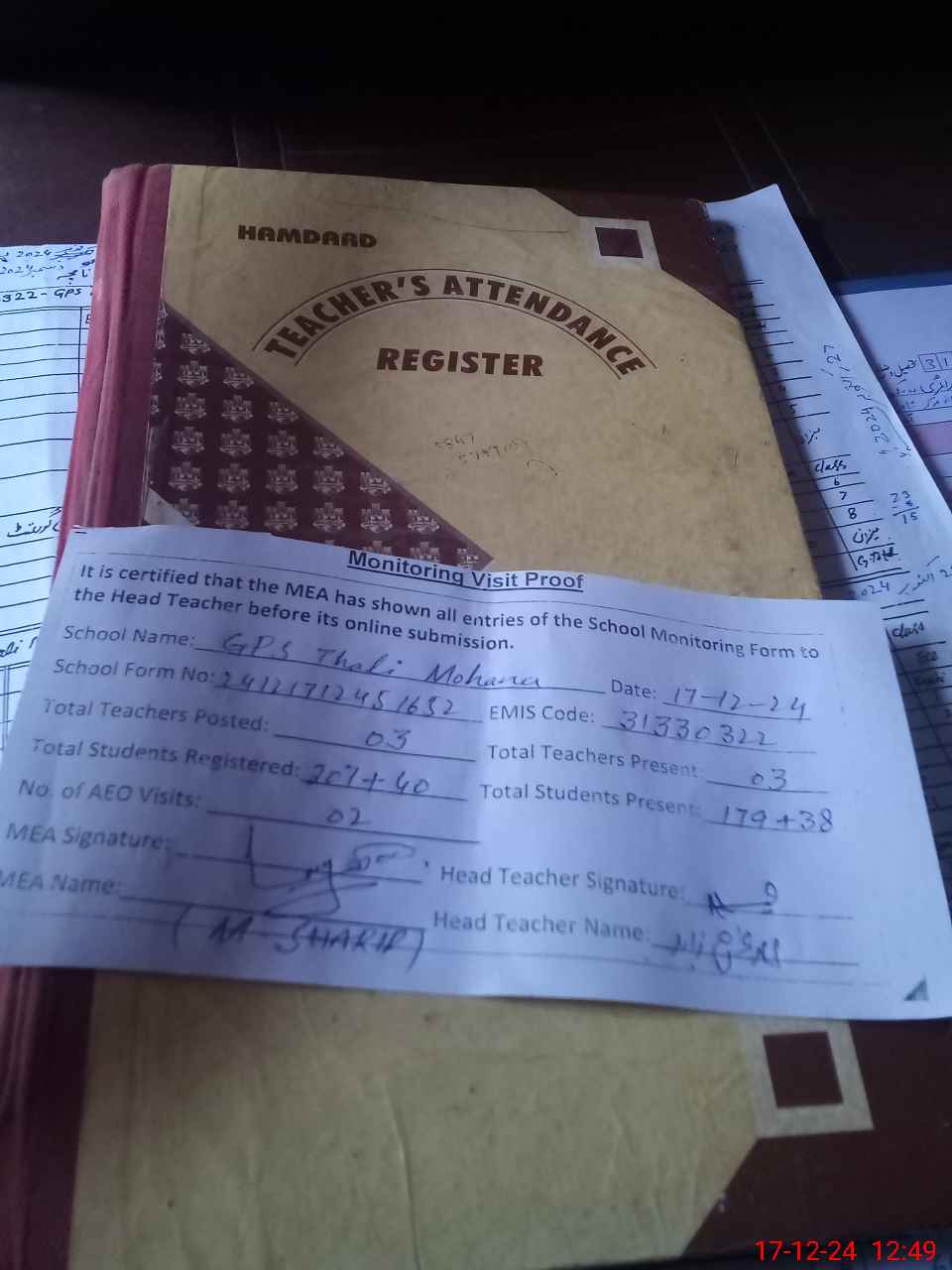 | Attendance Register | Head Teacher | MEA with School | Visit Proof |