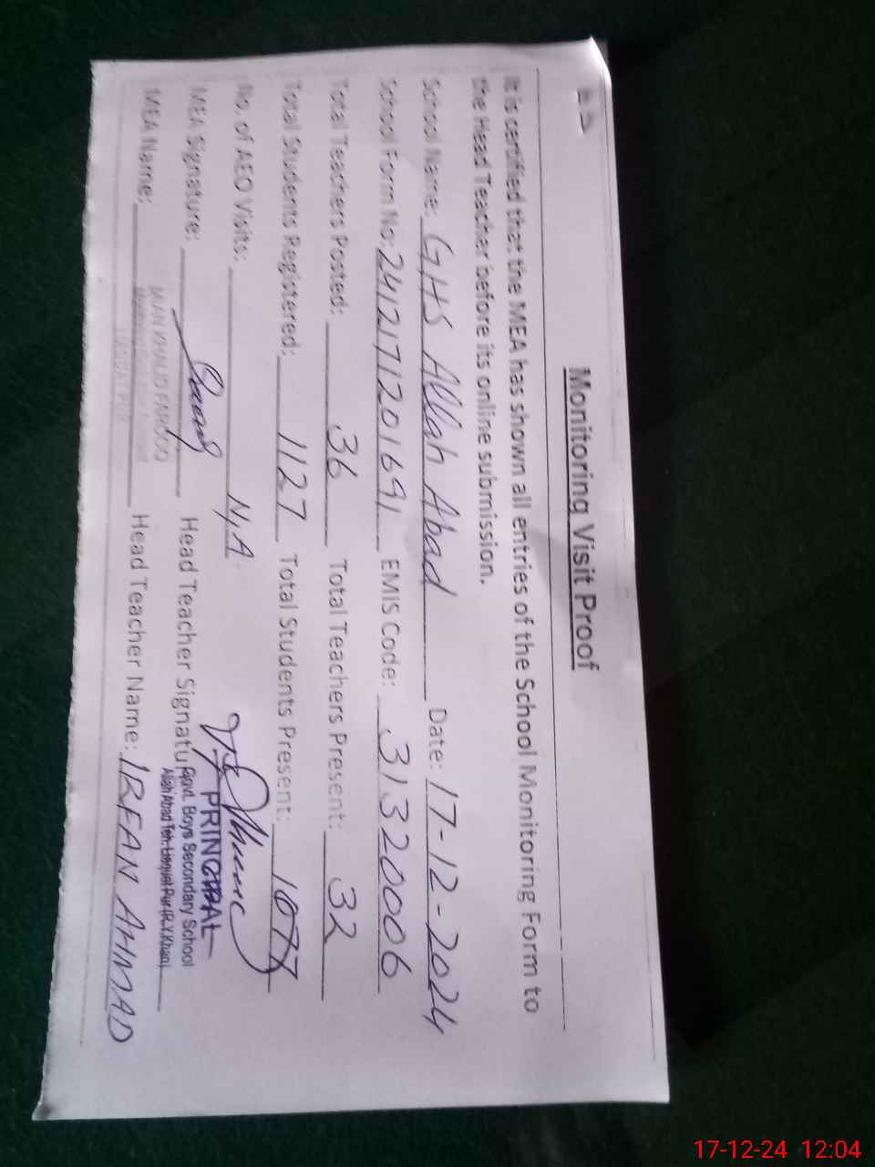 | Attendance Register | Head Teacher | MEA with School | Visit Proof |