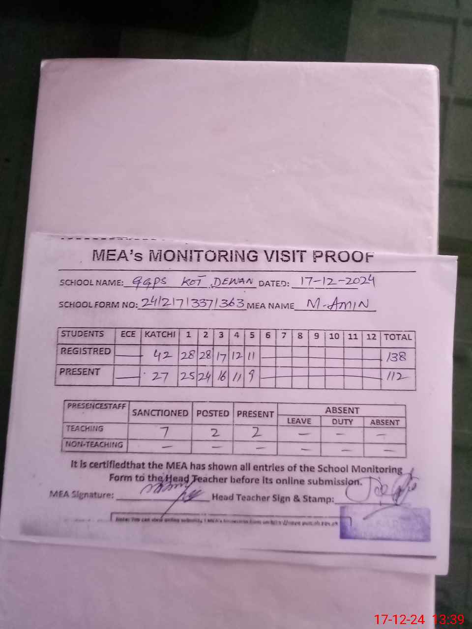 | Attendance Register | Head Teacher | MEA with School | Visit Proof |