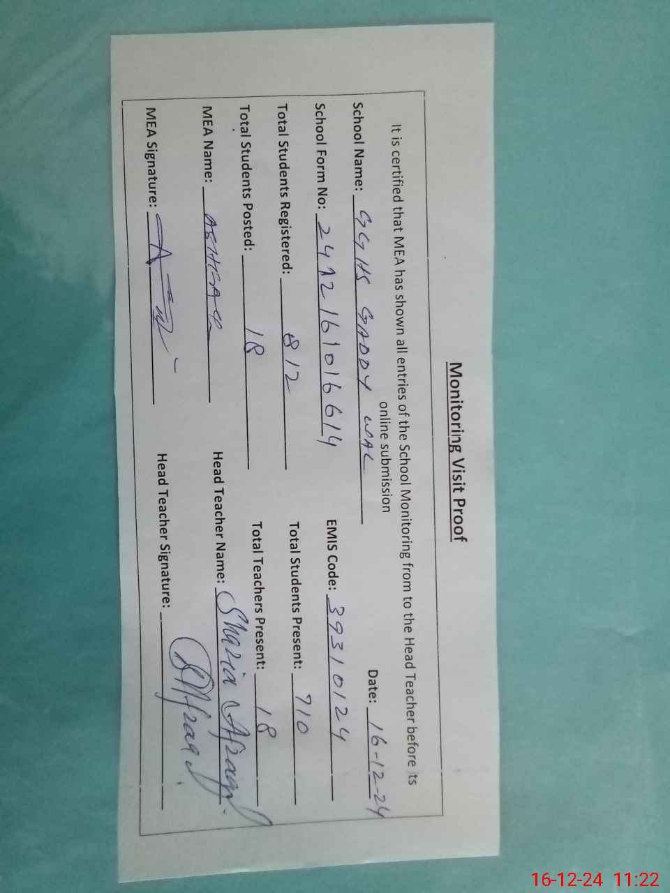| Attendance Register | Head Teacher | MEA with School | Visit Proof |