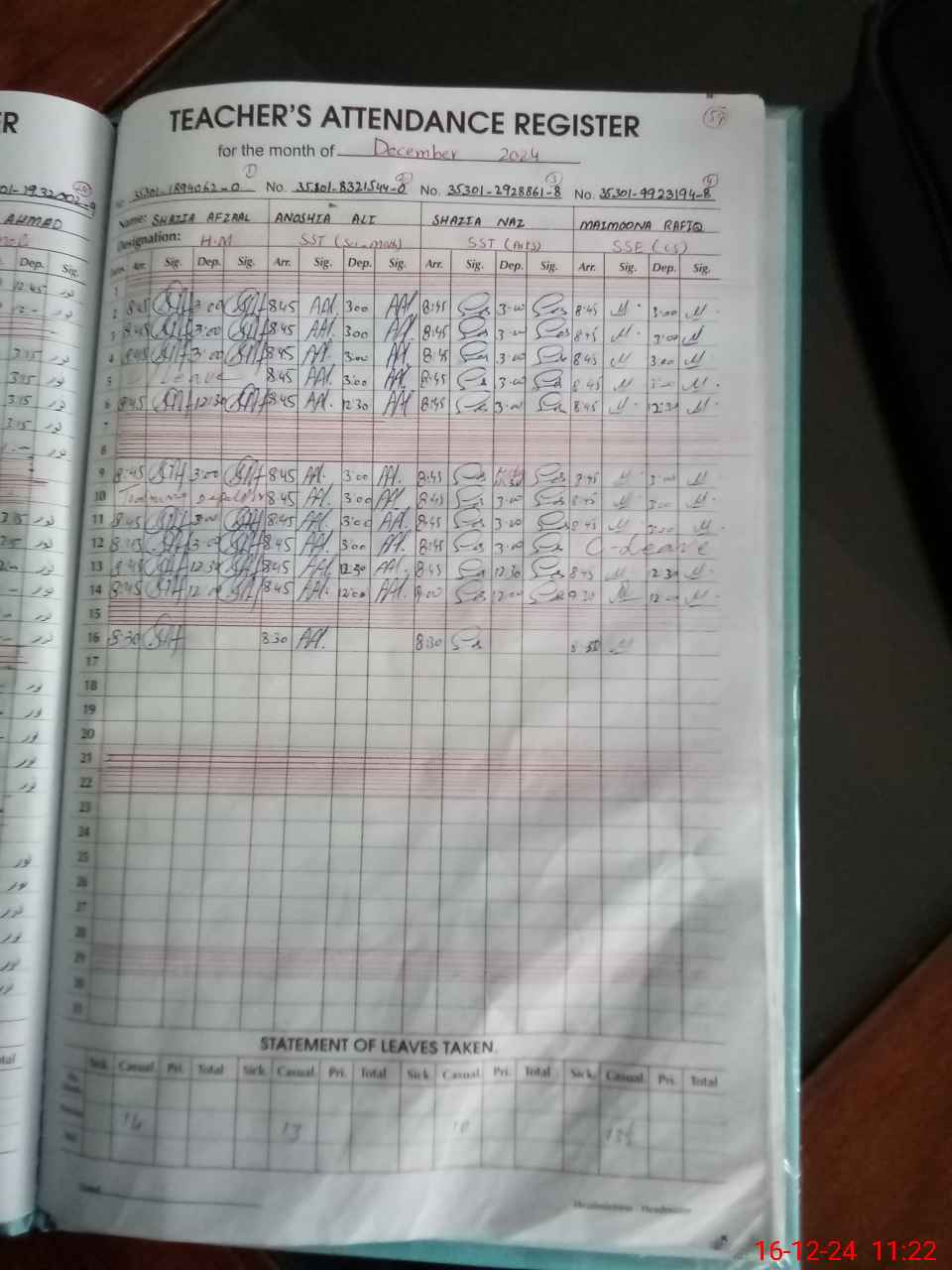 | CNIC | Full Name | Designation | R/C | Absence during last cal. month |