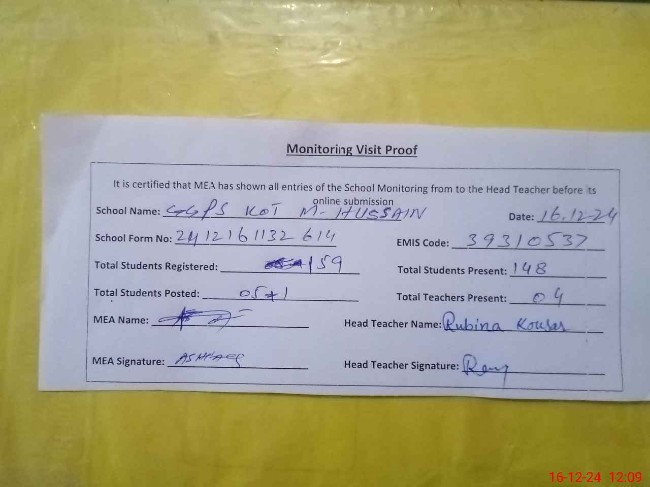 | EMIS Code: 39310537 | Name of School: GGPS KOT MUHAMMAD HUSSAIN (HUJRA) | |||