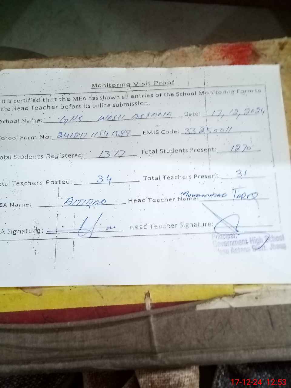 | EMIS Code: 33250011 | Name of School: GHS WASU ASTANA | |||