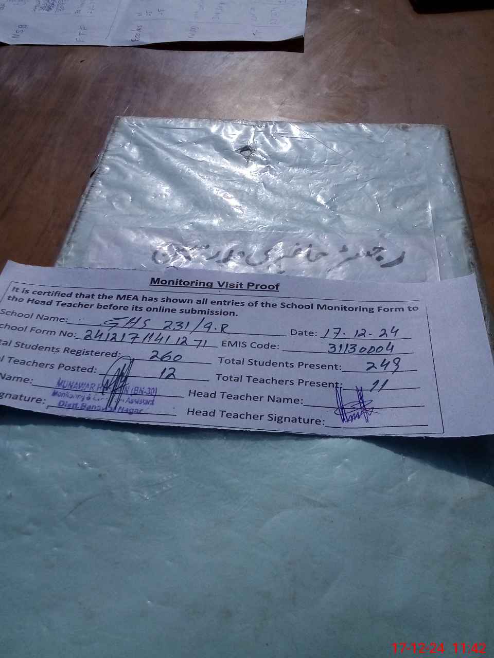 | Attendance Register | Head Teacher | MEA with School | Visit Proof |