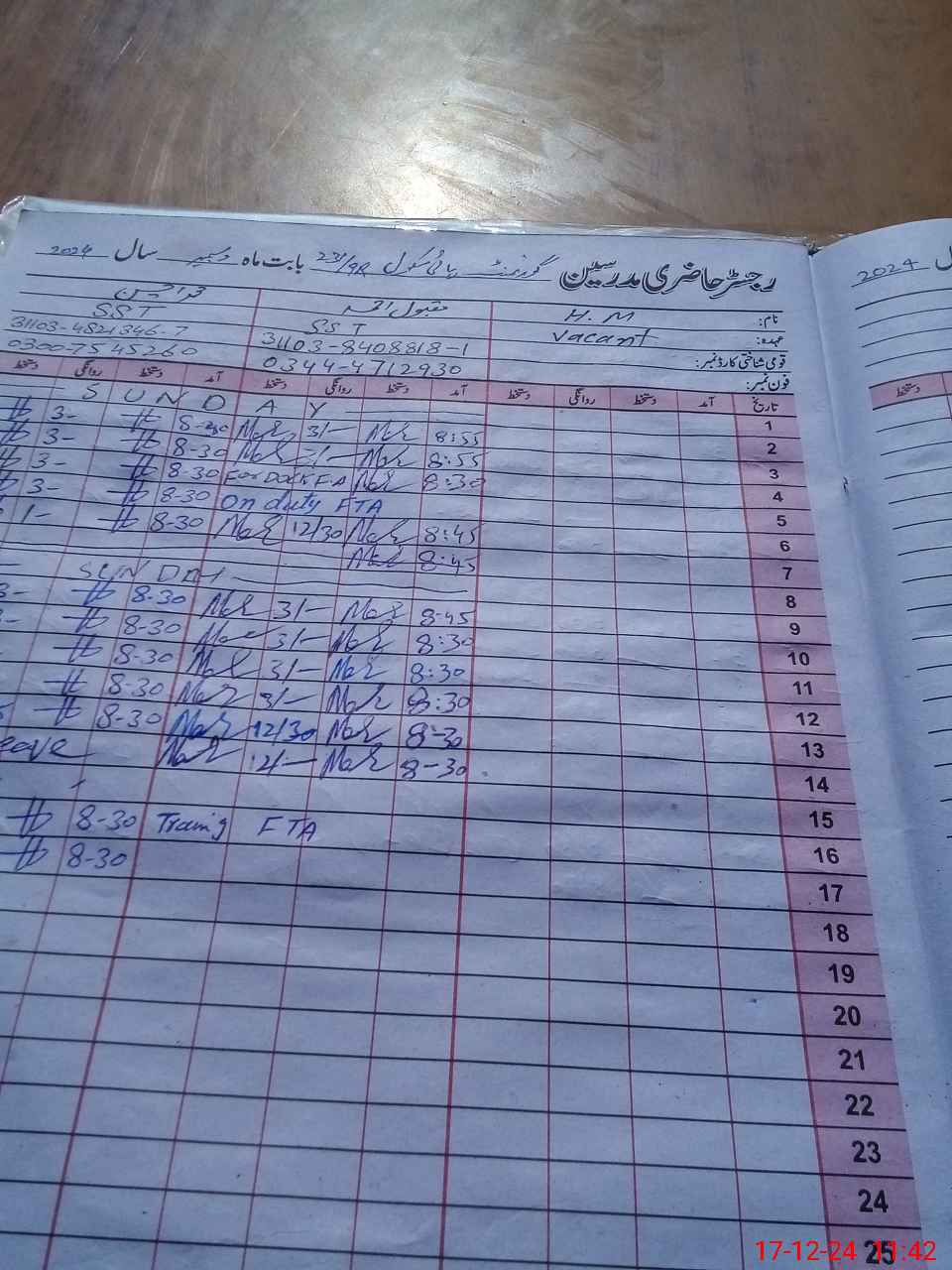 | CNIC | Full Name | Designation | R/C | Absence During Last Calender Month |