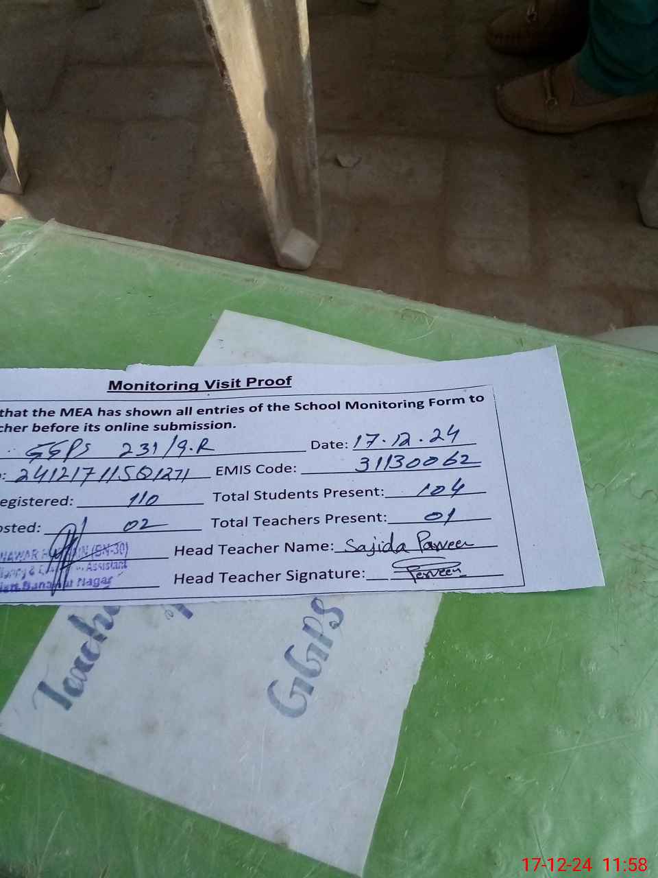 | Attendance Register | Head Teacher | MEA with School | Visit Proof |