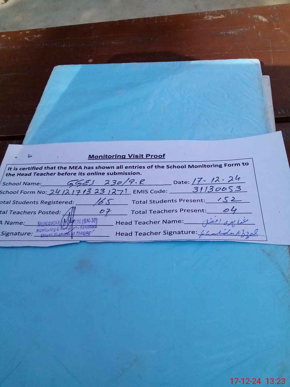 | Attendance Register | Head Teacher | MEA with School | Visit Proof |