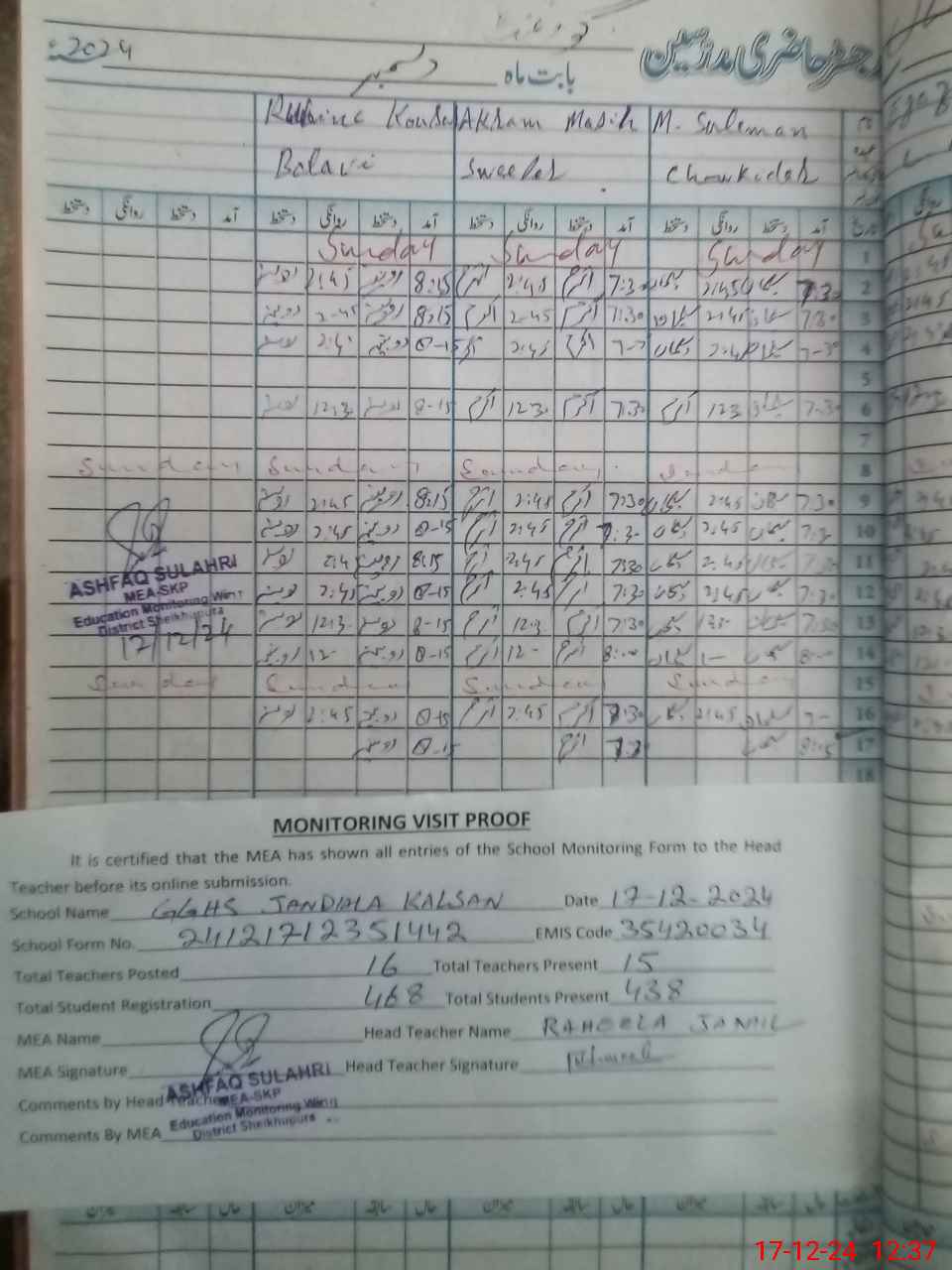 | Attendance Register | Head Teacher | MEA with School | Visit Proof |