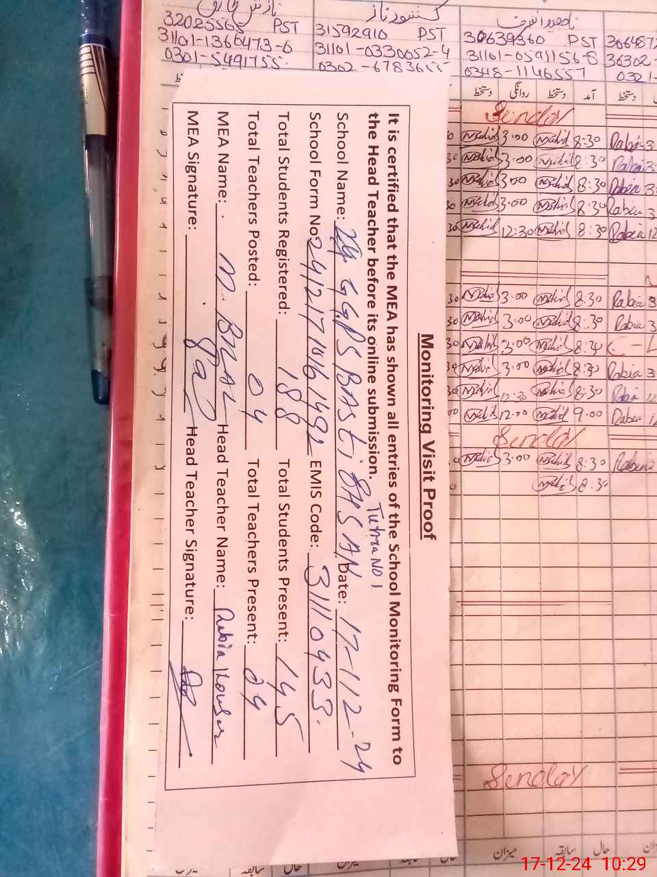 | Attendance Register | Head Teacher | MEA with School | Visit Proof |