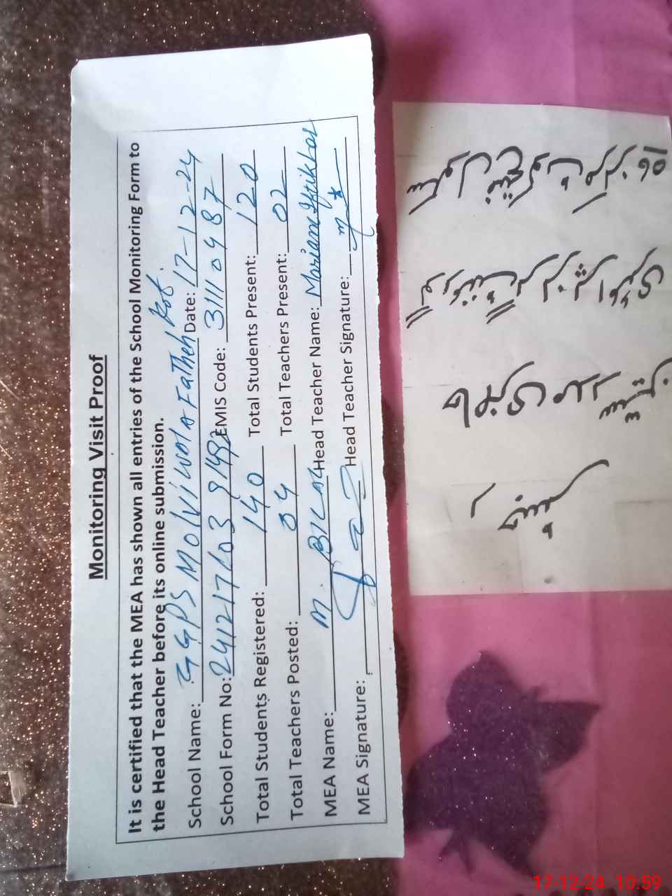 | Attendance Register | Head Teacher | MEA with School | Visit Proof |