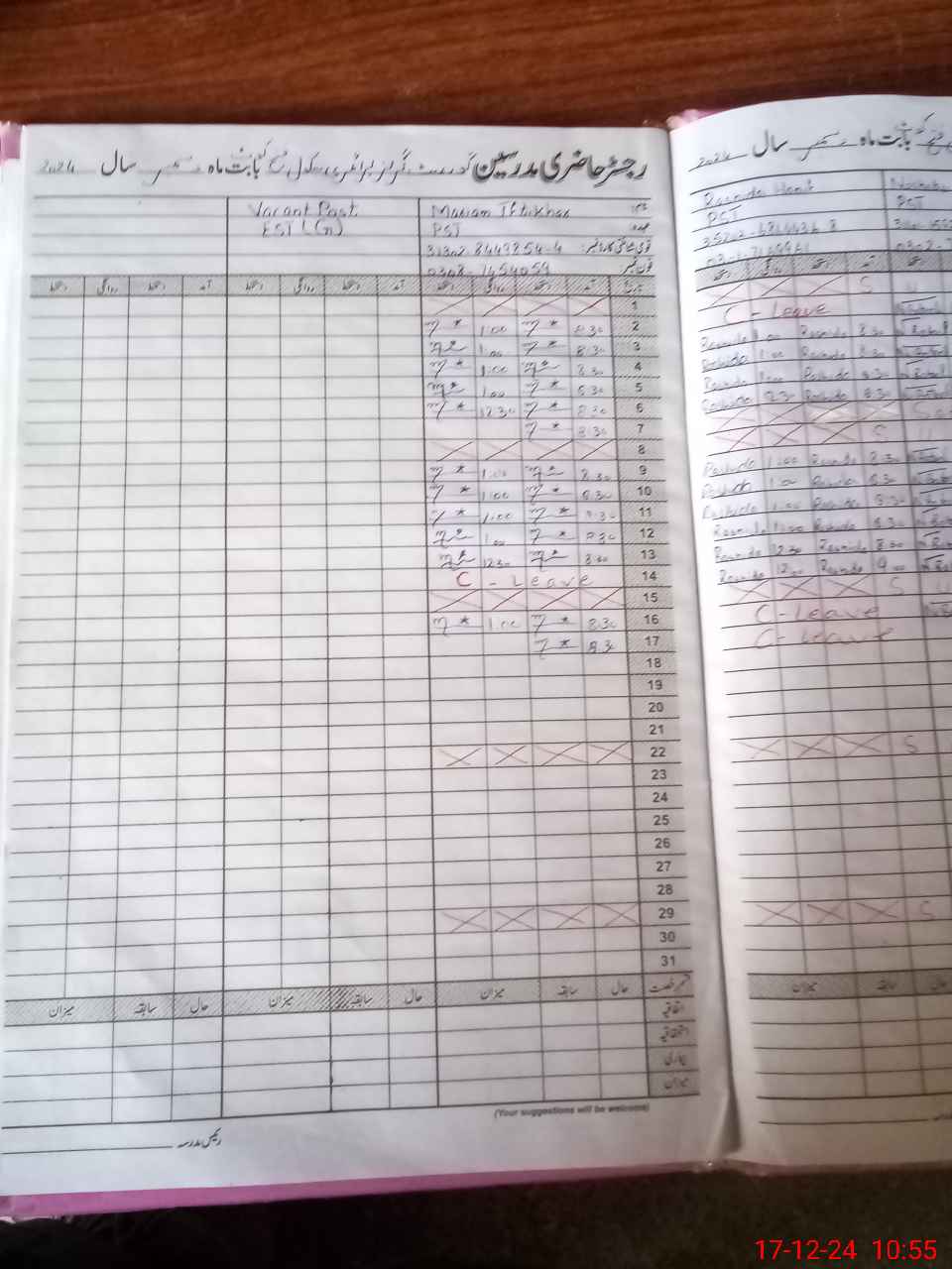 | CNIC | Full Name | Designation | R/C | Absence During Last Calender Month |