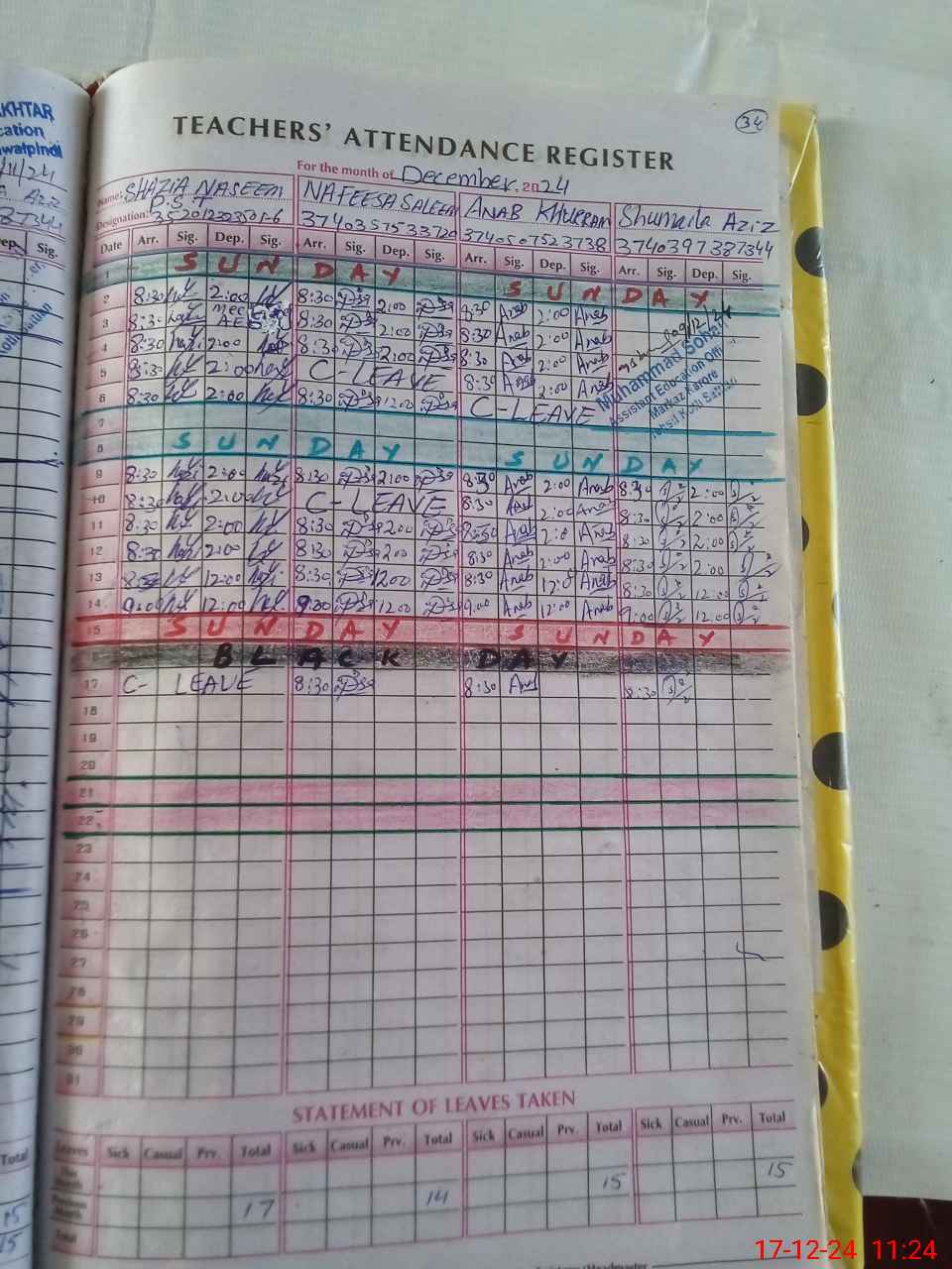 | CNIC | Full Name | Designation | R/C | Absence during last cal. month |