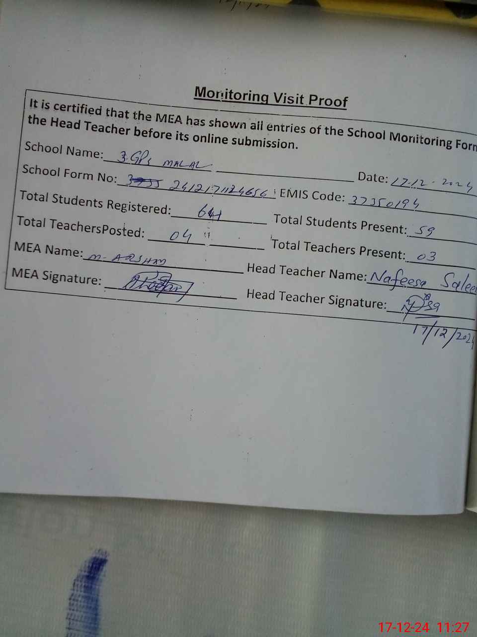| Attendance Register | Head Teacher | MEA with School | Visit Proof |