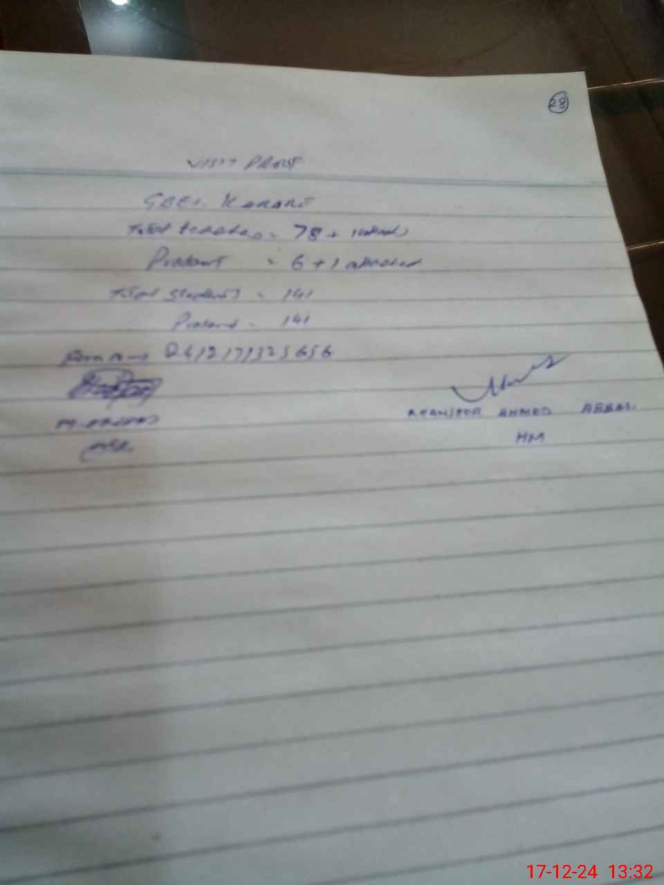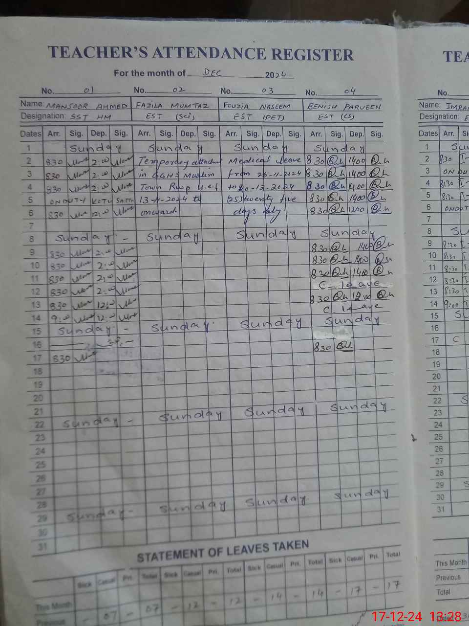 | Remarks (Use Separate Page if Required): 1 RAFI UZ ZAMAN PST Temporary attached in this school physically present 2 Fouzila Mumtaz EST sci temporarily attached with GGHS MUSLIM TOWN WEF 13 th November 2024 till today | |||||