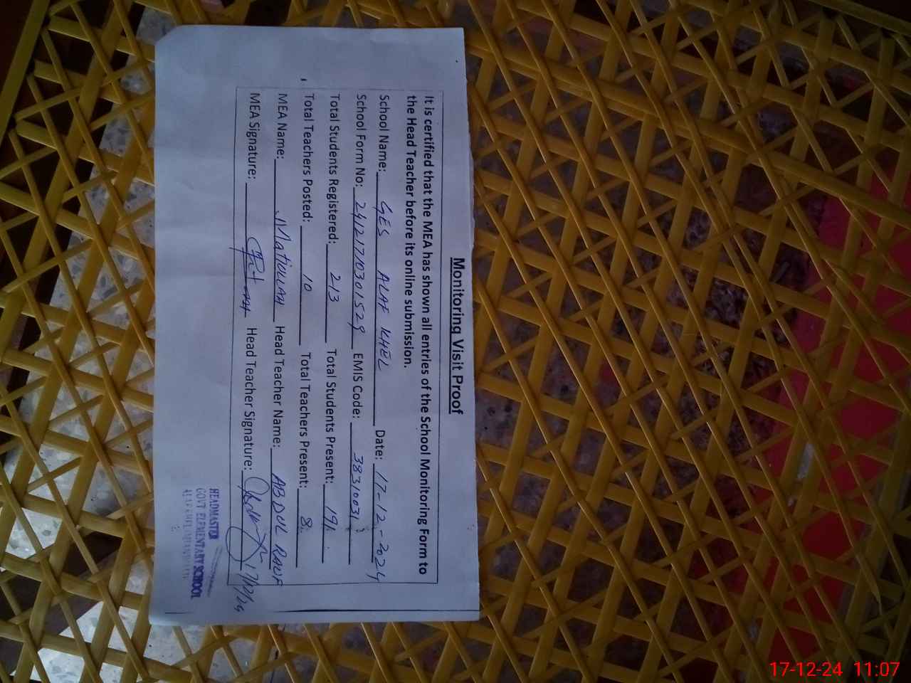 | Attendance Register | Head Teacher | MEA with School | Visit Proof |