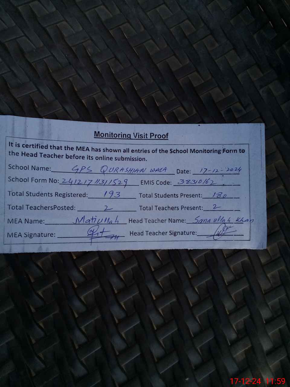 | Attendance Register | Head Teacher | MEA with School | Visit Proof |