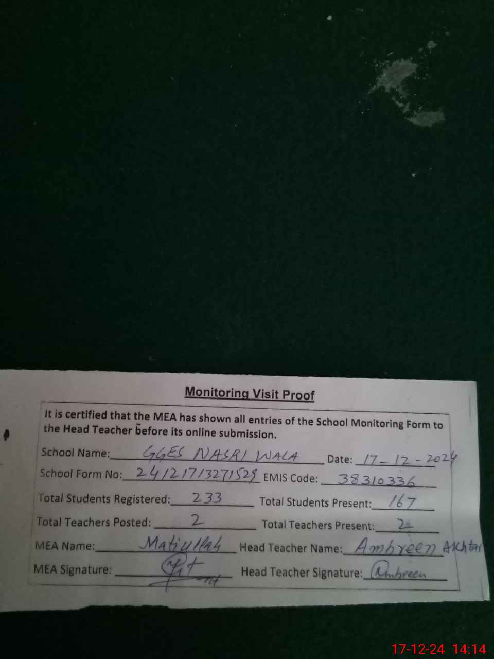 | Attendance Register | Head Teacher | MEA with School | Visit Proof |