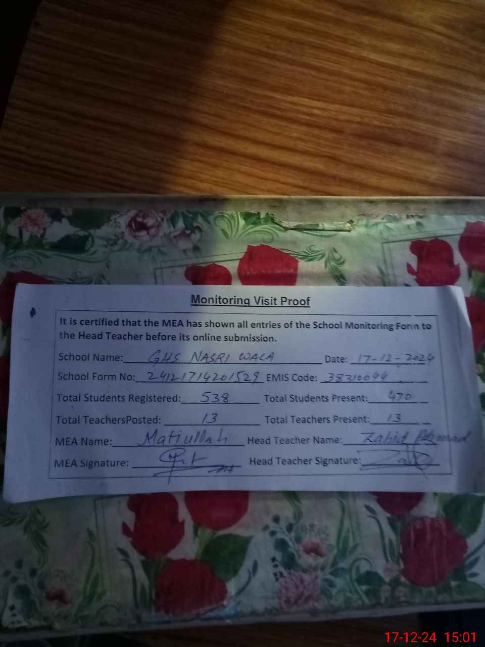 | Attendance Register | Head Teacher | MEA with School | Visit Proof |