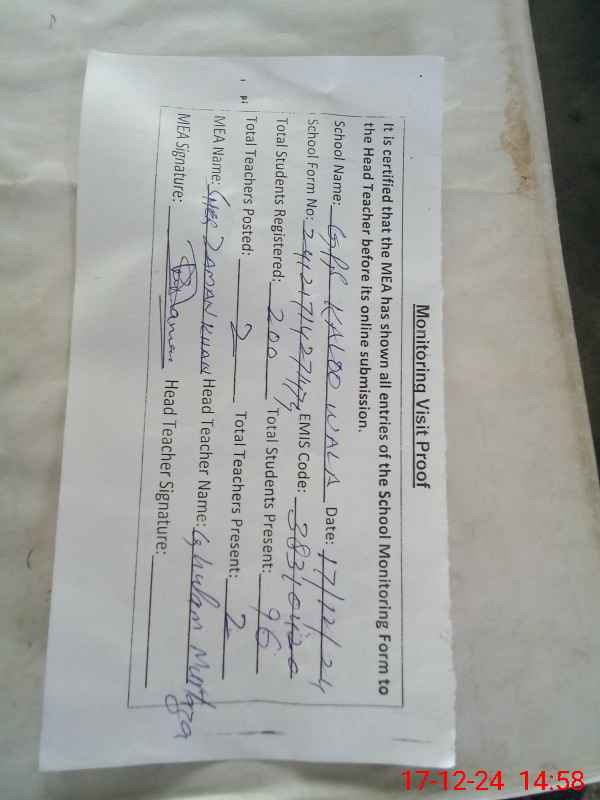 | Remarks (Use Separate Page if Required): Behaviour of MUHAMMAD JAMIL was very roud and threthening style Head teacher refuse to sign the visit proof | |||||