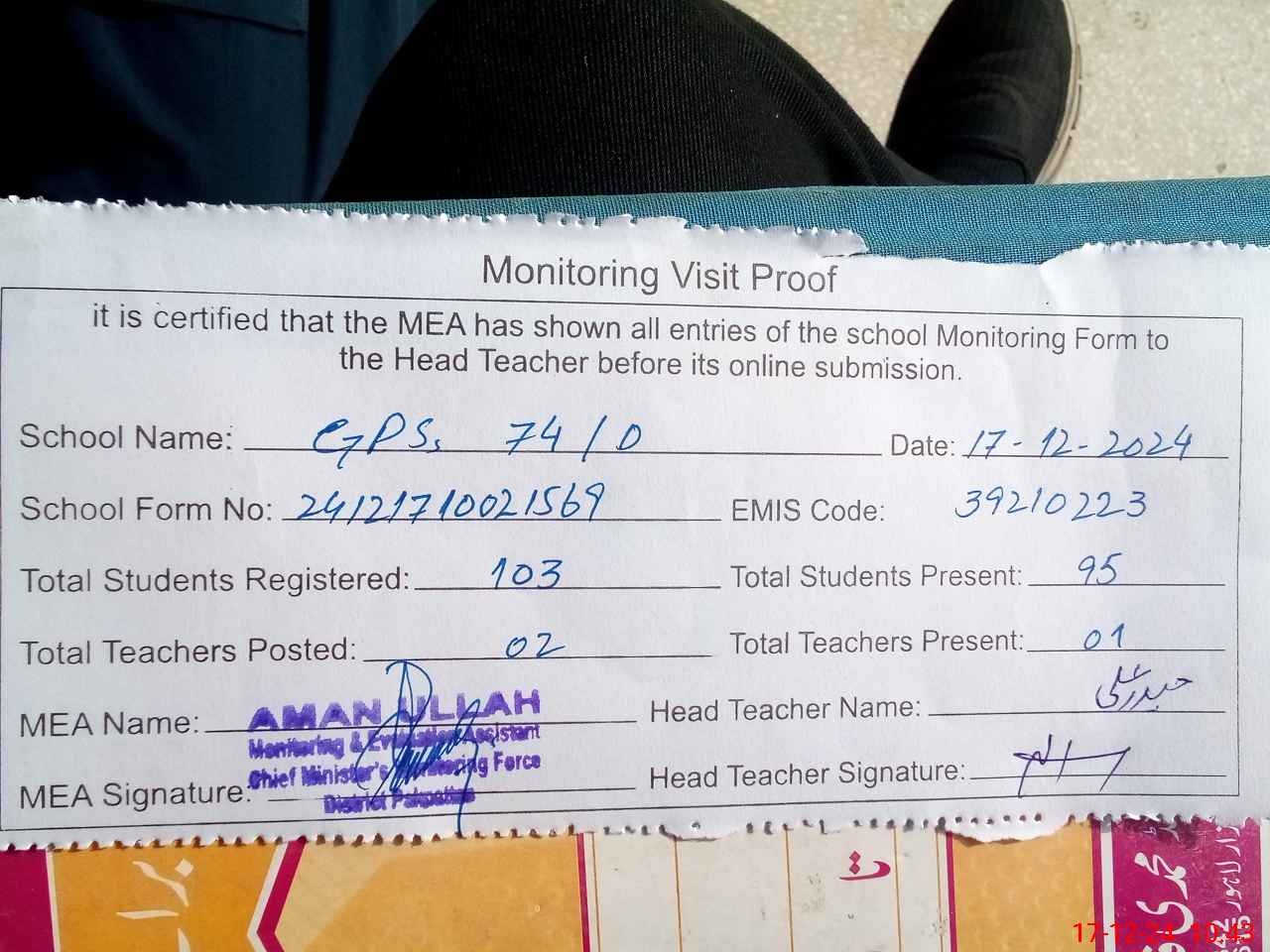 | Attendance Register | Head Teacher | MEA with School | Visit Proof |