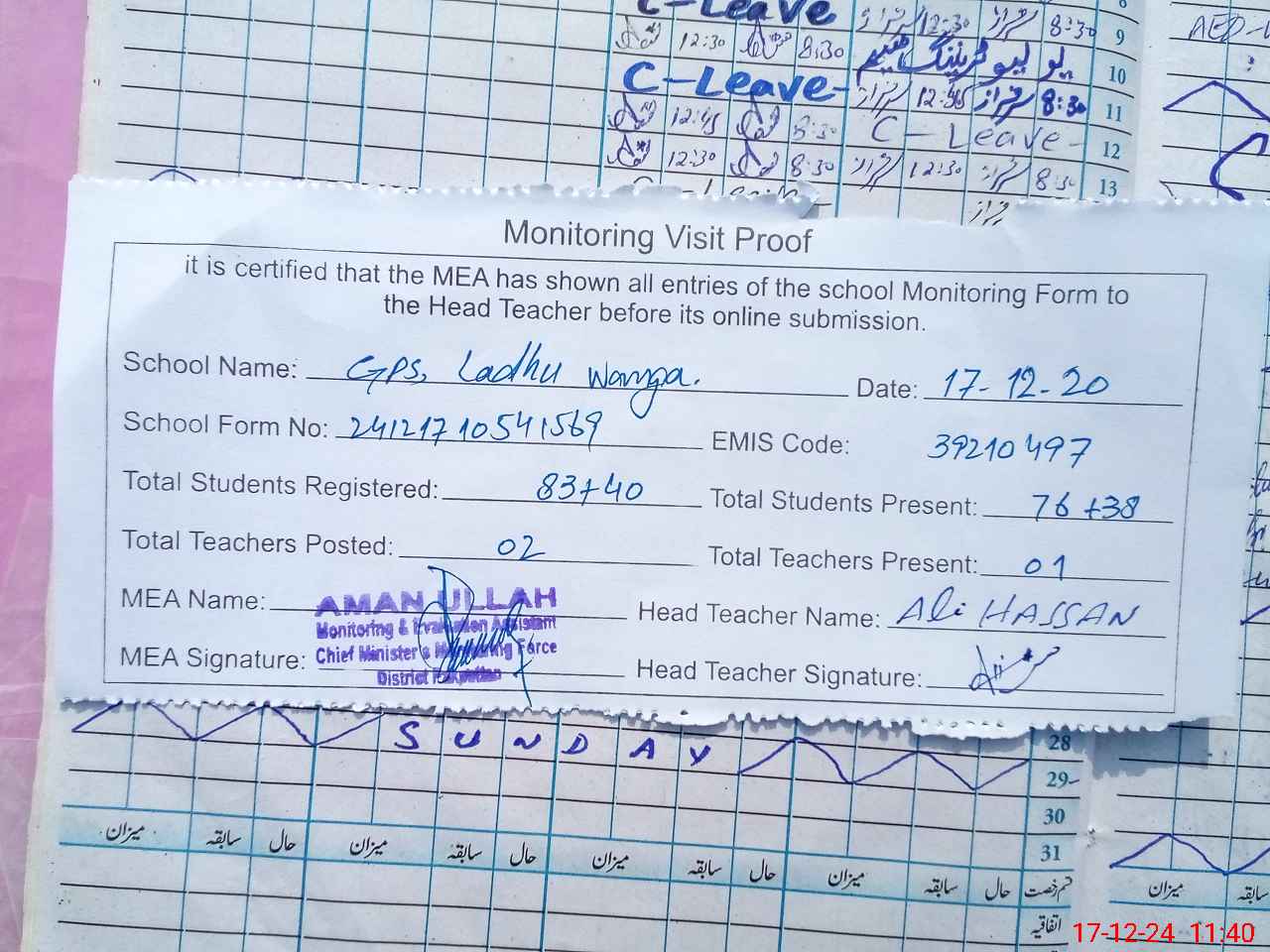 | Attendance Register | Head Teacher | MEA with School | Visit Proof |