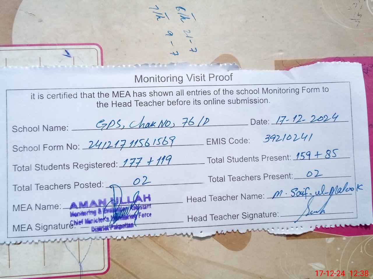 | EMIS Code: 39210241 | Name of School: GPS CHAK NO. 76/D | |||
