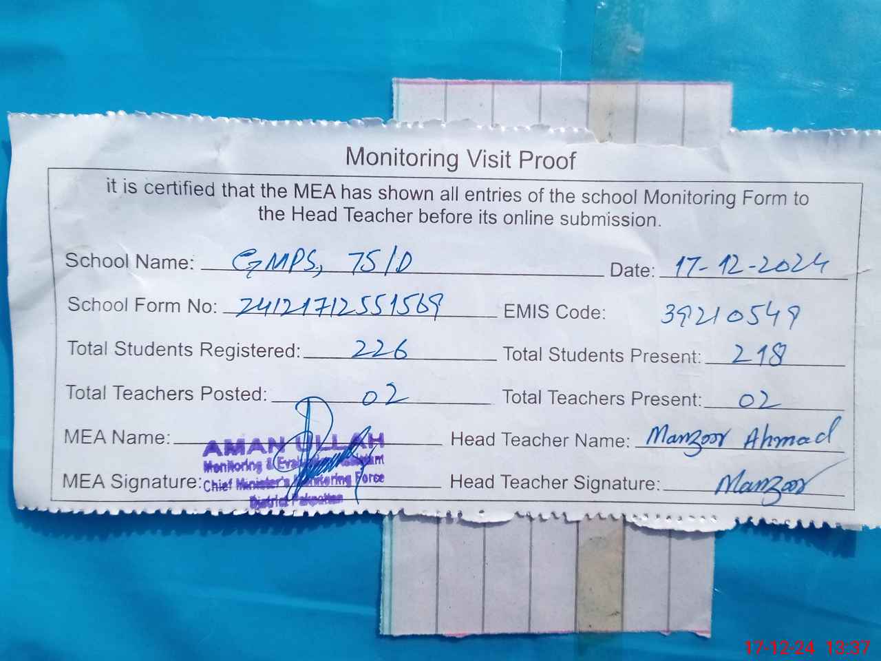| Attendance Register | Head Teacher | MEA with School | Visit Proof |