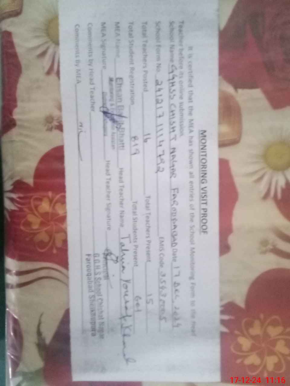 | Attendance Register | Head Teacher | MEA with School | Visit Proof |