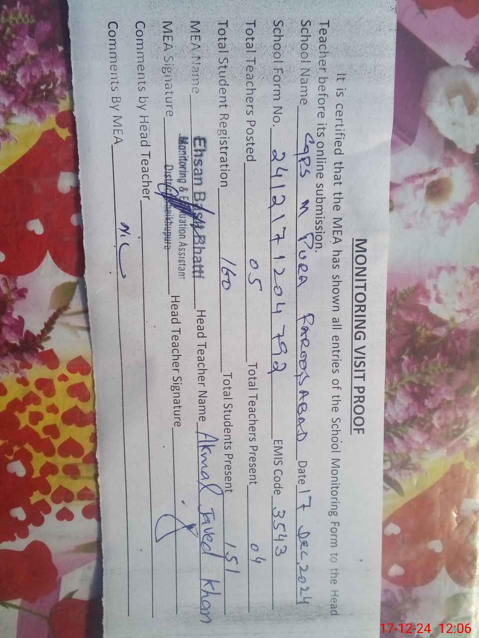 | Attendance Register | Head Teacher | MEA with School | Visit Proof |
